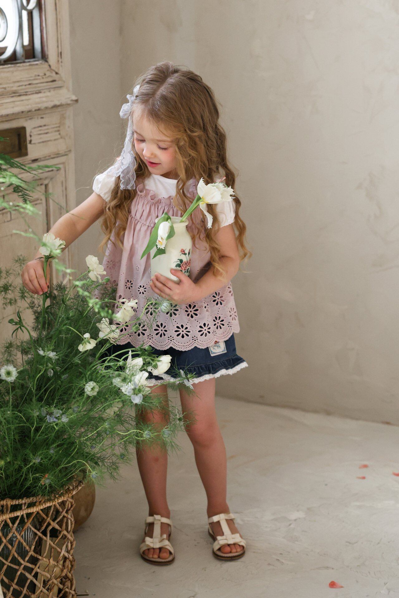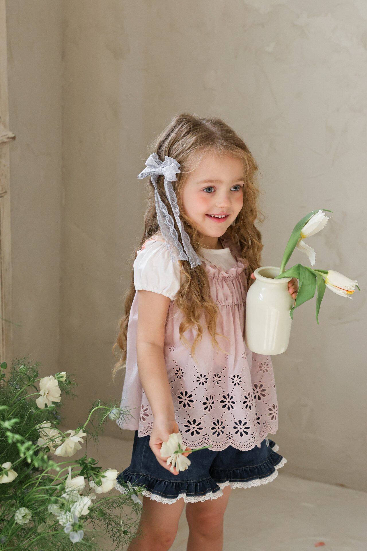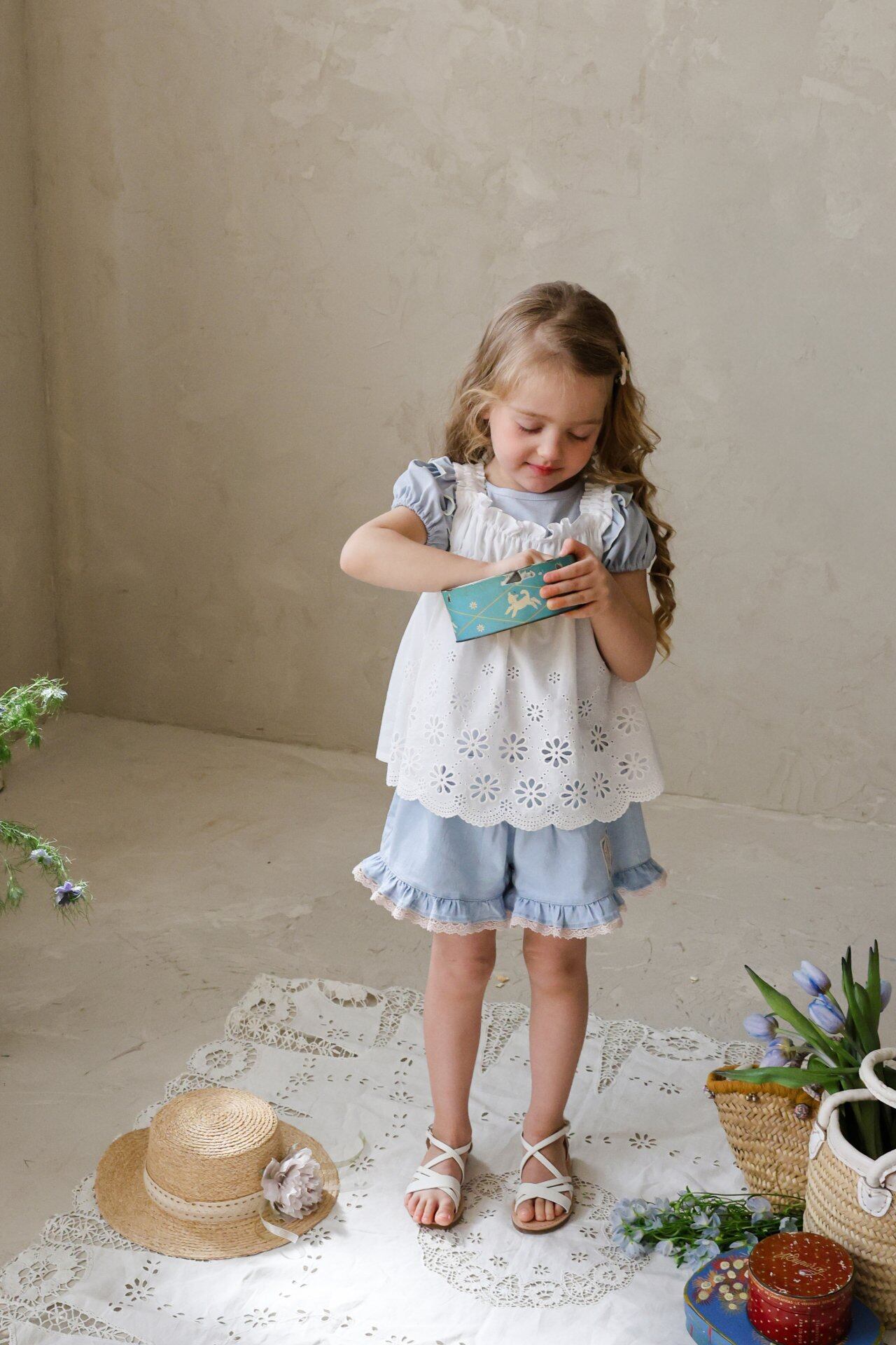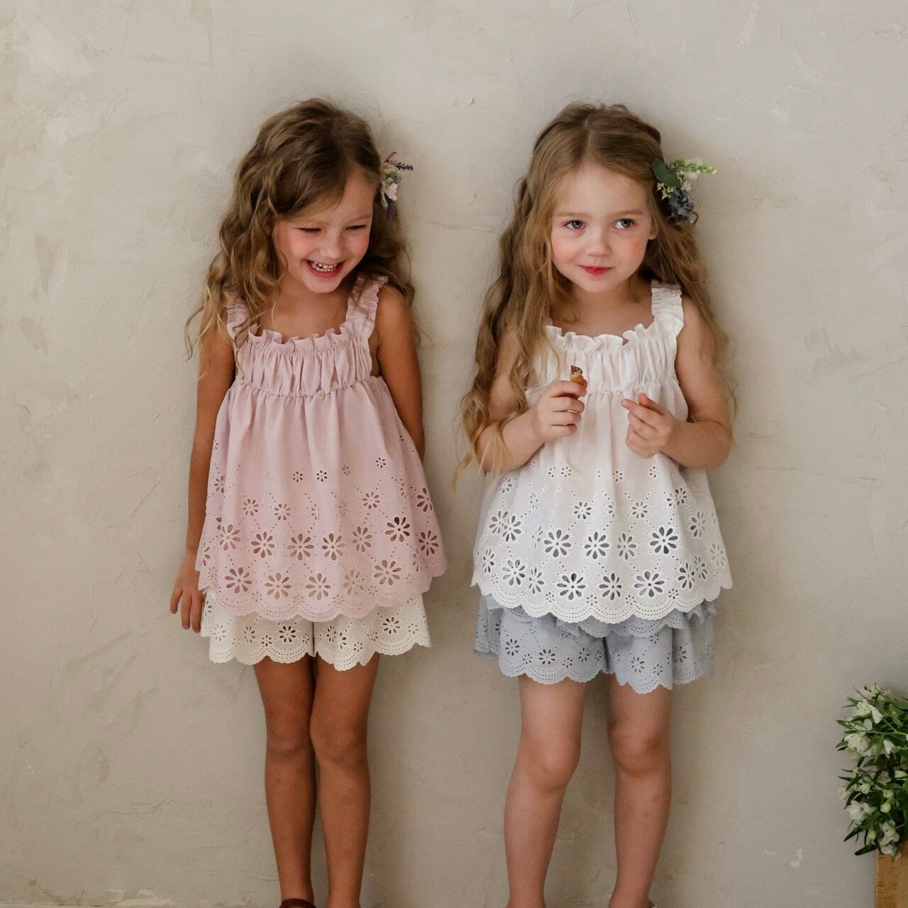繊細なレースデザインとパンチングディテールをあしらい、夏でも涼しく軽やかに着用でき、やさしく広がる愛らしいムードが魅力のアイテムです。