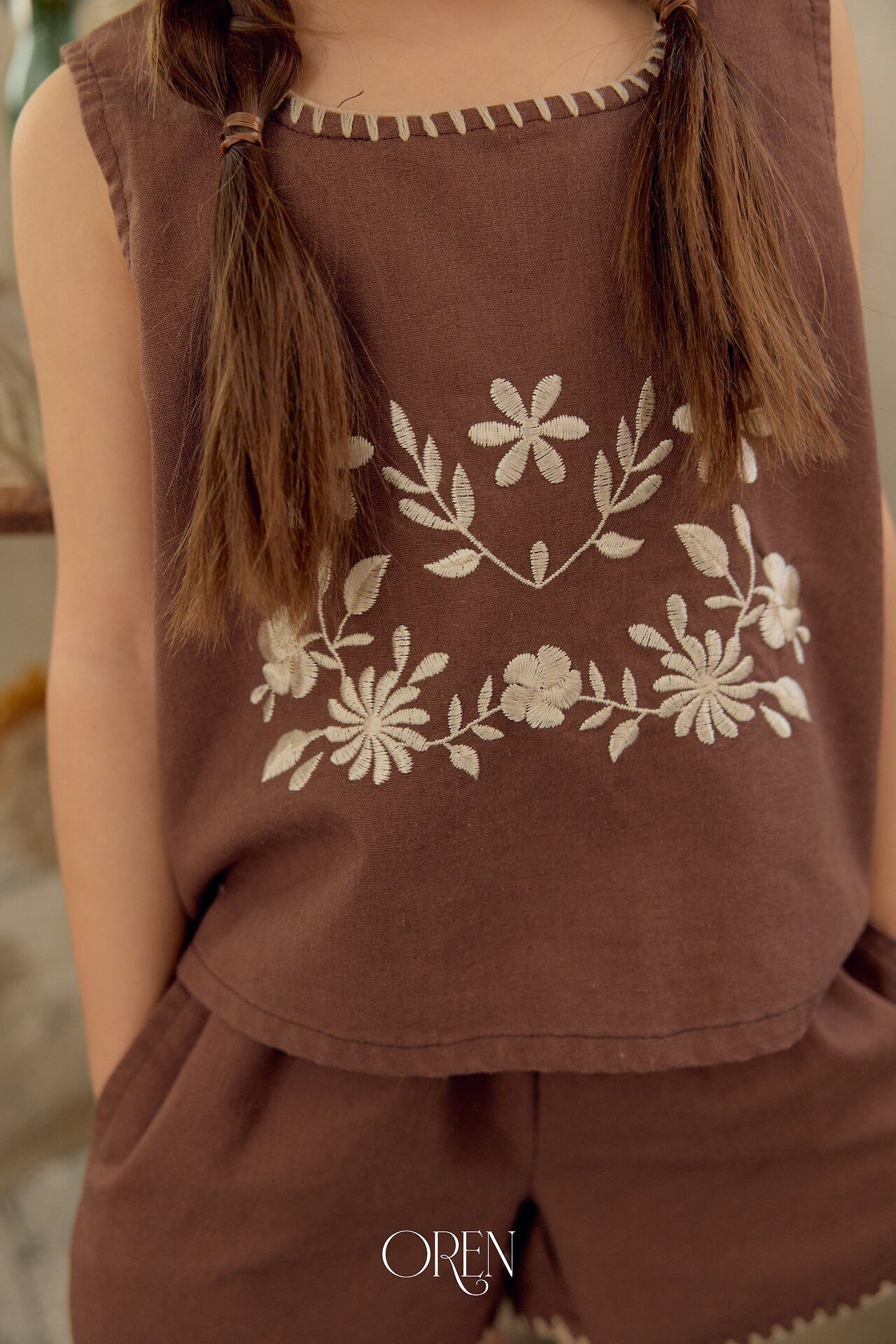 ナチュラルな風合いが魅力のリネン混素材に、繊細なフラワー刺繍を施したセットアップです。